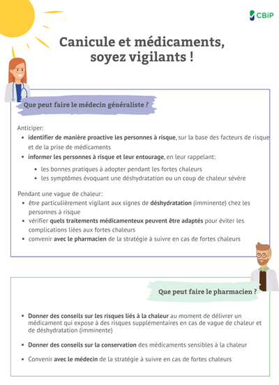 Les fortes chaleurs et les périodes de canicule entraînent des risques pour la santé. Dans l’article Folia « Canicule et médicaments, soyez vigilants ! », vous trouverez des informations et des conseils qui peuvent vous aider à accompagner les patients (notamment les patients à risque) en prévision d’une canicule ou pendant une canicule.