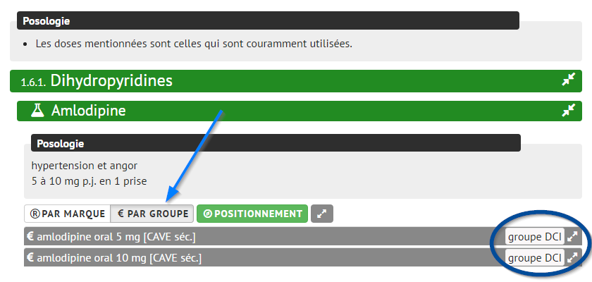 Le nom d’un groupe DCI donne une description générale des spécialités au sein de ce groupe qui sont en principe interchangeables, comme par exemple “amlodipine oral 5 mg”. Le nom d’un groupe DCI peut être utilisé pour la prescription en DCI. Si des spécifications supplémentaires sont suffisamment pertinentes pour être mentionnées sur la prescription (p.ex. sécable, soluble), le médecin en est alerté par un message CAVE.